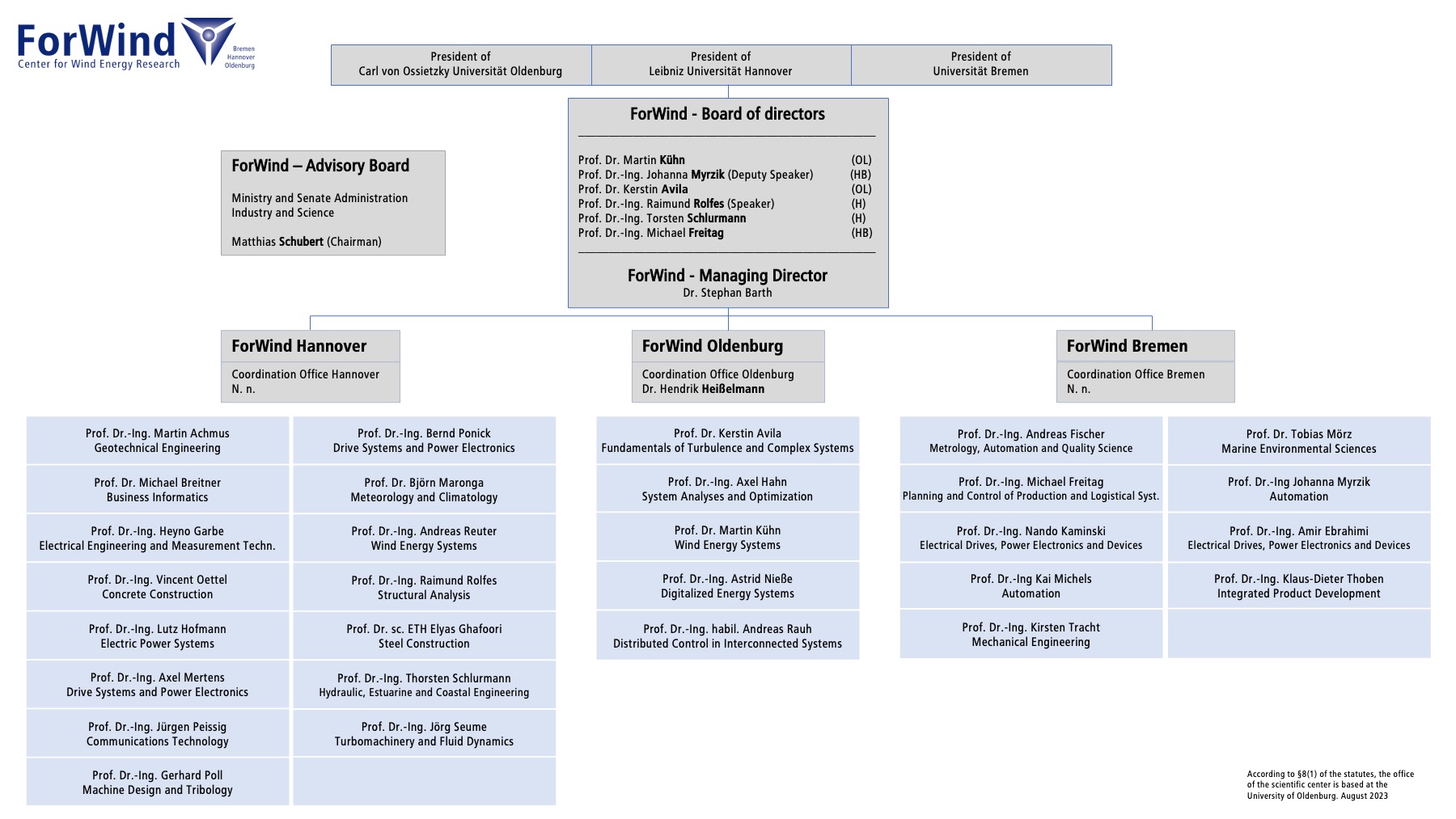 The current board consists of Prof. Dr. Joachim Peinke, Prof. Dr.-Ing. Michael Freitag, Prof. Dr. Martin Kühn, Prof. Dr.-Ing. Johanna Myrzik (deputy scientific speaker), Prof. Dr.-Ing. habil. Raimund Rolfes (scientific speaker) and Prof. Dr.-Ing. Torsten Schlurmann.