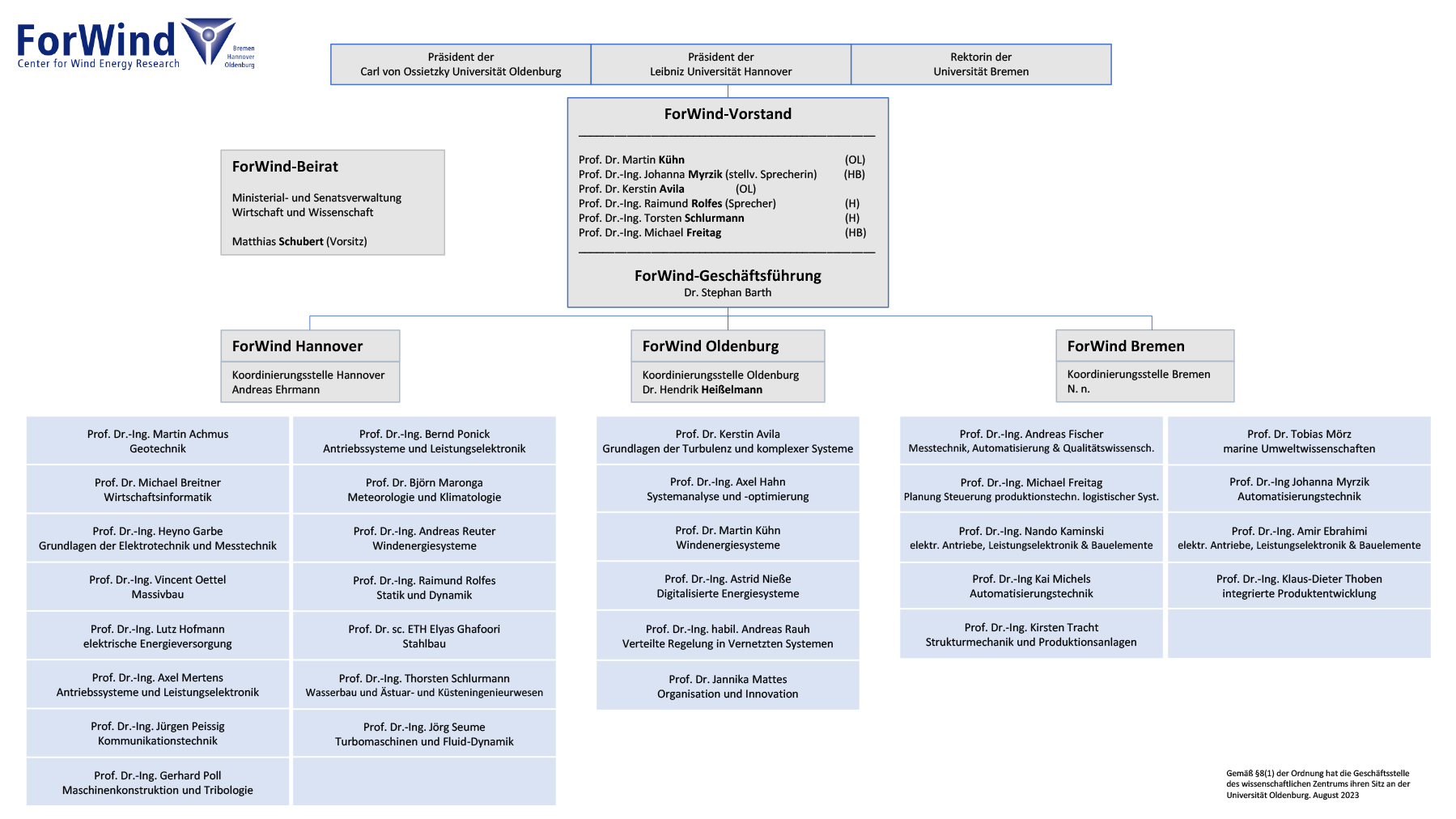 Der aktuelle Vorstand setzt sich zusammen aus Prof. Dr. Kerstin Avila, Prof. Dr.-Ing. Michael Freitag, Prof. Dr. Martin Kühn, Prof. Dr.-Ing. Johanna Myrzik (stellv. wissenschaftliche Sprecherin), Prof. Dr.-Ing. habil. Raimund Rolfes (wissenschaftlicher Sprecher) und Prof. Dr.-Ing. Torsten Schlurmann.